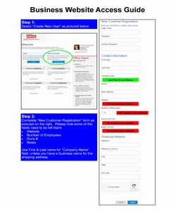 Step 1: Online Access | Required Only the Office Depot Business site will have your Boy Scouts of America pricing and services for ordering printing, supplies, furniture, cleaning & breakroom to be delivered to your location. (Other logons that you may have used in the past with Office Depot/OfficeMax may not have your Boy Scouts of America pricing and services.) Please self register for immediate online access from the "Create Online User Login" button below. Important Note: A guide to the right is available to help your through the next steps, please click to enlarge or print. We also have some FAQ's that may help if you have any error messages. Once you have access you can logon from this web address: www.business.officedepot.com | ||
